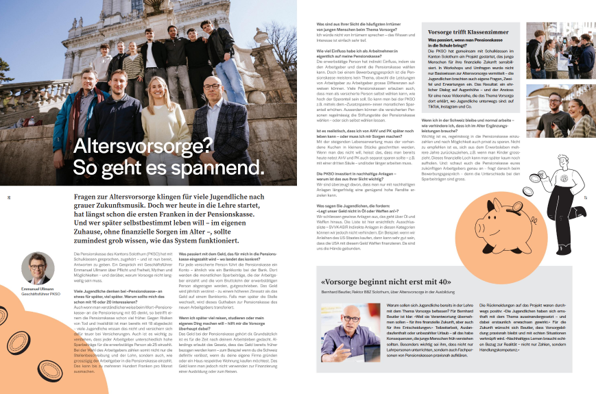 Für Jugendliche ein trockenes Thema. Doch bereits in der Lehre, ist man ab 18 Jahren versichert. Wir von der PKSO finden, dann sollten also auch Schülerinnen und Schüler des Berufsbildungszentrums Solothurn-Grenchen die Grundlagen unseres Drei-Säulen-Systems in der Schweiz kennen.